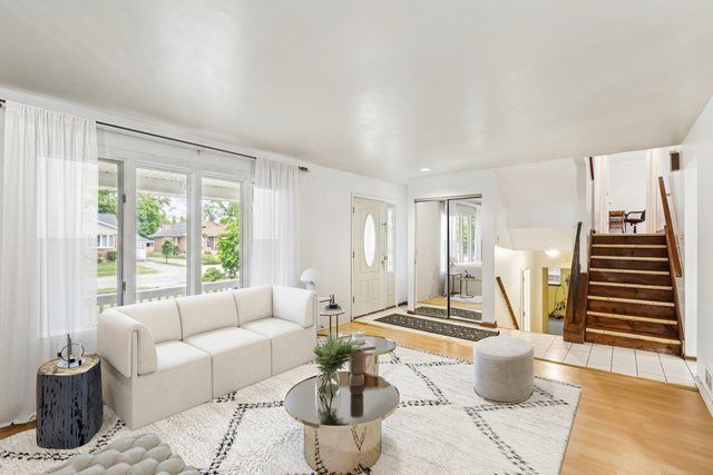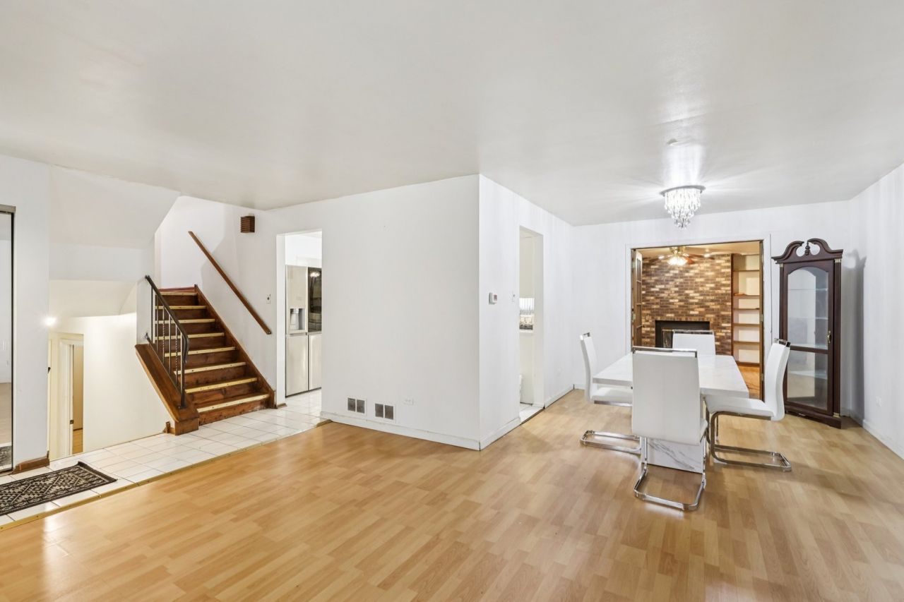 Spacious 5-bedroom, 3-bath split-level home with an attached 2-car garage is ready for you to make it your own. The main level features a bright living room that flows seamlessly into an L-shaped dining room. The updated white kitchen boasts newer stainless steel appliances, ample counter space, and room for a breakfast table, and opens to a cozy family room with a classic brick fireplace. Upstairs, you'll find four generously sized bedrooms, including an incredible primary suite that occupies its own private level. This retreat features vaulted ceilings, space for a seating area, and a private balcony. The en suite bath includes a Jacuzzi tub, dual vanity, walk-in shower, and skylights. An additional oversized bonus room offers endless possibilities as a home office, lounge, or the ultimate walk-in closet. Three additional bedrooms are located on the second level, including one with direct access to the hall bath. The finished lower level includes another bedroom, a bonus room and a full bath with a walk-in showers. A sunroom leads to a large deck overlooking the fenced backyard, perfect for outdoor entertaining. Conveniently located near parks, shopping, dining, and with easy access to I-294, this home truly has it all!